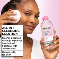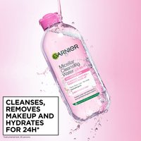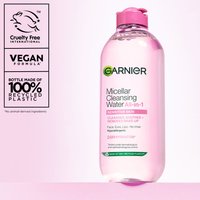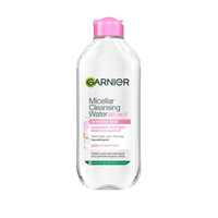 Nærende ansiktsrens og sminkefjerner i ett. Garnier Micellar Cleansing Water Normal & Sensitive Skin 400 ml er et micellært rensevann med en nærende formel som raskt renser huden og samtidig fjerner sminke. Uten parfyme og egnet for normal til sensitiv hud. Testet under oftalmologisk og dermatologisk kontroll. Garniers micellærvannserie er basert på pleiende produktformuleringer som raskt renser huden og samtidig fjerner sminke, slik at du sparer tid og etterlater huden frisk og behagelig!