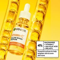 Garnier SkinActive Vitamin C* Serum er et glødgivende serum som reduserer alle typer mørke flekker og gjør huden mer jevn. Formelen er beriket med 4% niacinamid + C-Vitamin * + salisylsyre + MelasylTM. Føles ikke klissete og trekker raskt inn i huden.
